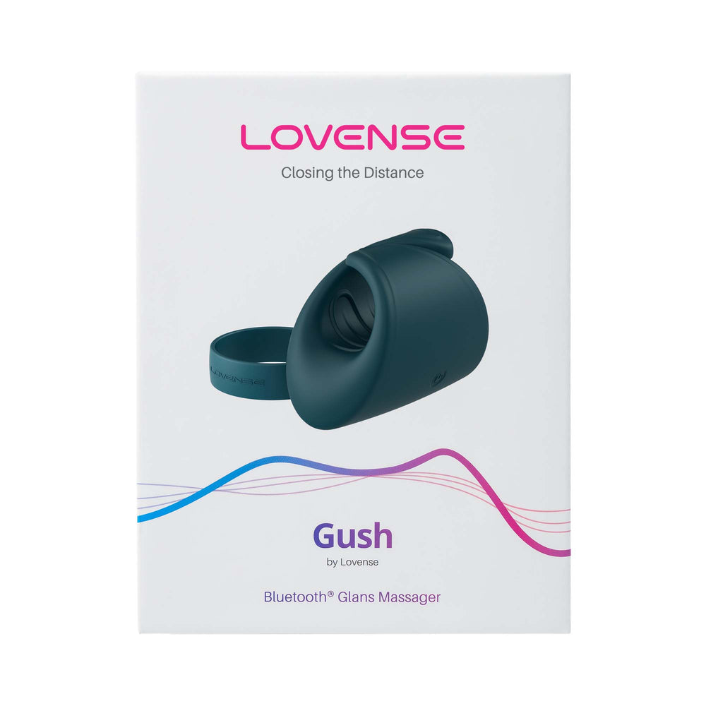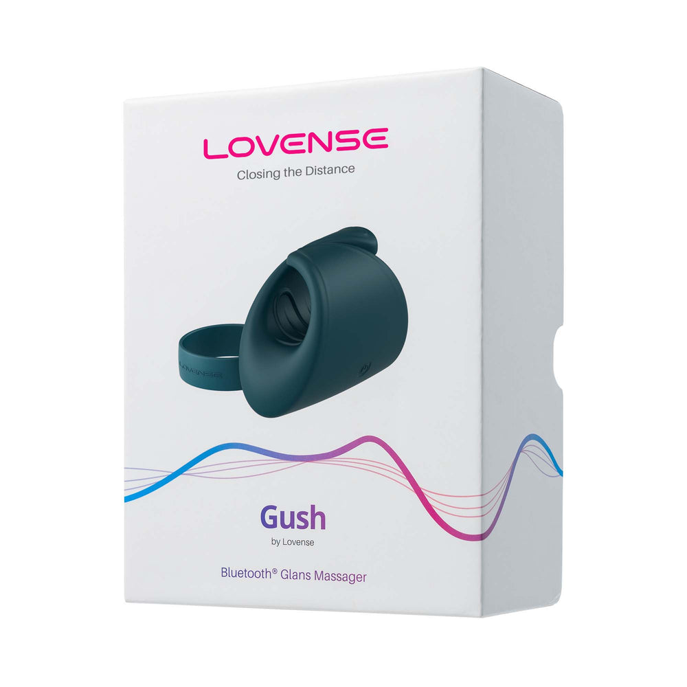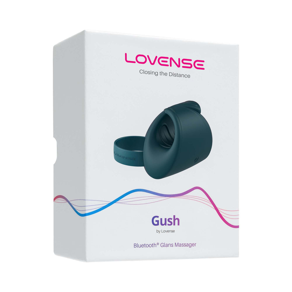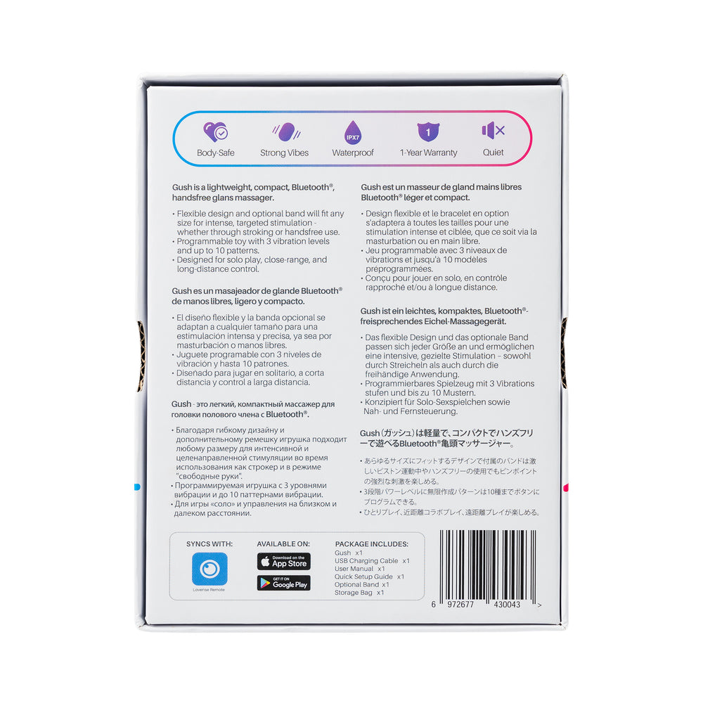 Box includes: Gush Flexible Masturbator, Optional Band, USB Charging Cable, and User Manual.